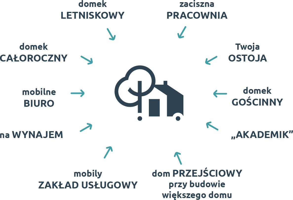 Każdy domek jest inny i dostosowany do wymagań klienta. Mogą być większe lub mniejsze, mieć przewagę okien lub ścian, posiadać jedno wejście lub kilka. Można je ogrzać energią słoneczną, prądem z sieci lub kominkiem. Wodę możemy czerpać z wodociągów albo zbiorników wody – zewnętrznych lub wewnętrznych. Nieczystości możemy odprowadzać do kanalizacji, szamba lub zastosować toaletę kompostującą lub spalającą. Domek może być zbudowany w taki sposób, że będzie zupełnie niezależny od cywilizacji.