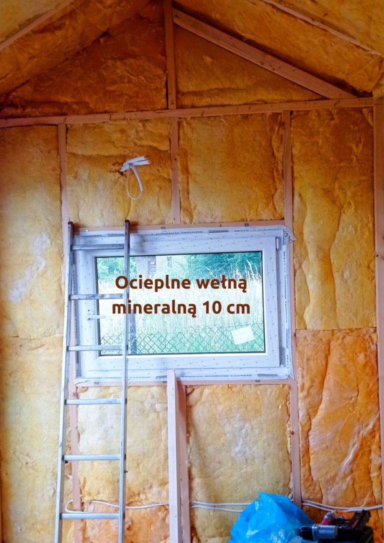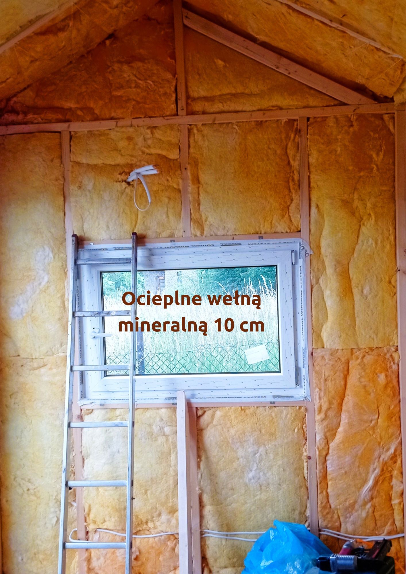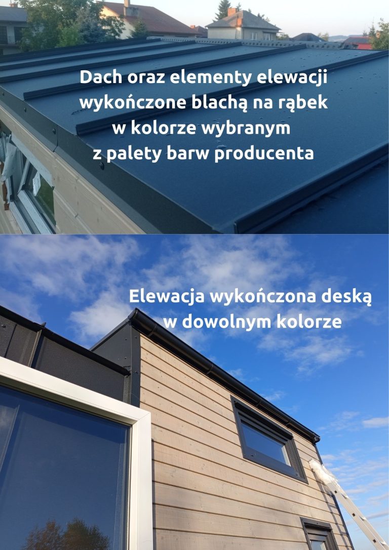 Ściany ocieplone wełną mineralną. Wykończenie elewacji stanowi blacha na rąbek oraz naturalna deska elewacyjna.