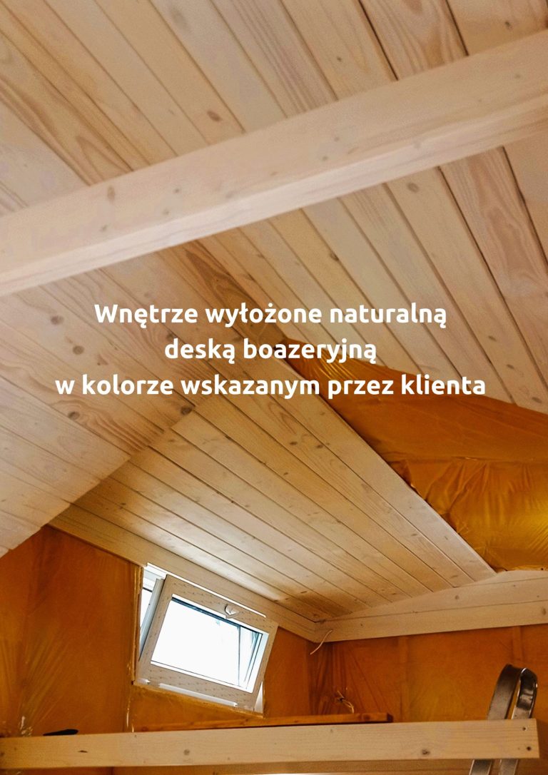 Ściany od wewnątrz wyłożone drewnianą deską boazeryjną pomalowaną na biało, z zachowaniem naturalnej struktury drewna.